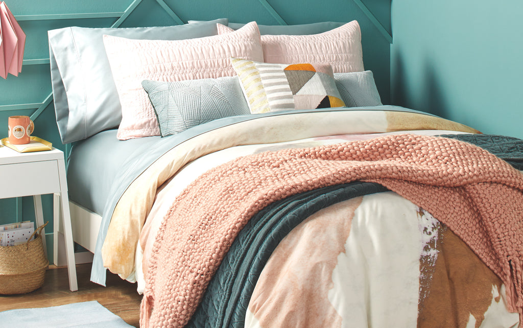 Regardless of the time of year, adding layers is key to having a styled bed that looks inviting and comfortable. Opt for neutrals and cozy textures, or play with patterns and colors to create some depth and contrast.