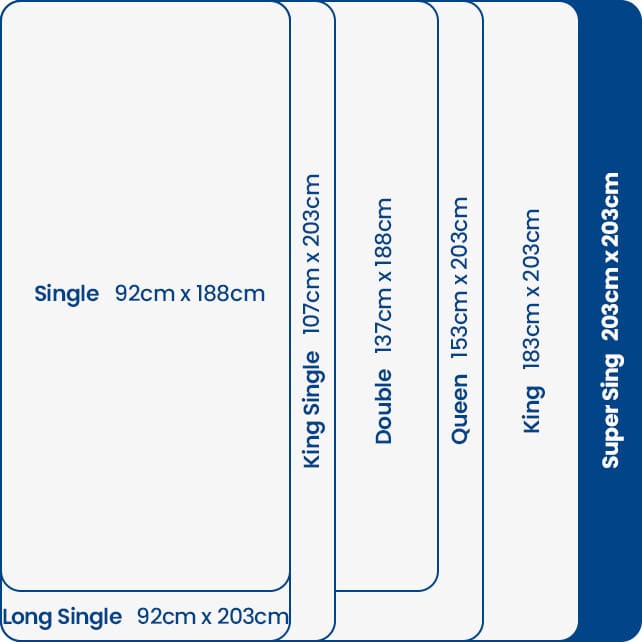 The standard size for a Super king mattress in Australia is 203 cm wide × 203 cm long. Ideal for the luxurious sleepers.